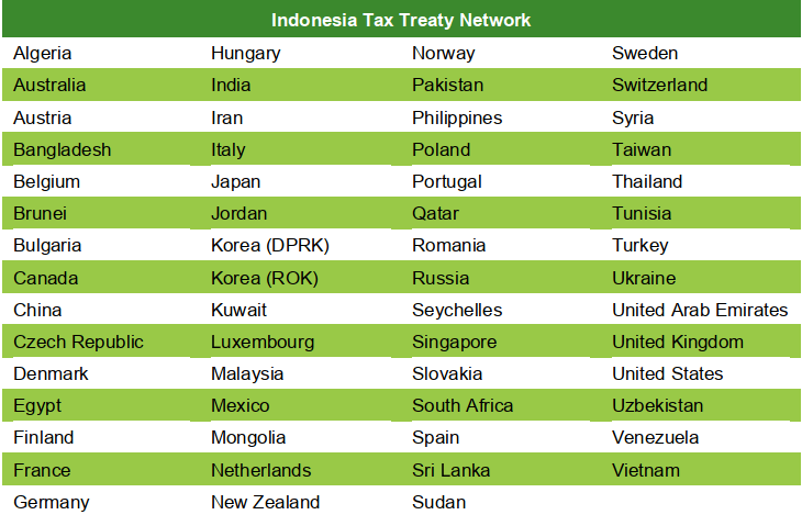 Indonesia has a reasonably broad tax treaty network. To claim relief under a tax treaty, the foreign taxpayer must complete and submit to the Indonesian tax authorities a specific document issued by the Indonesian Tax Office in lieu of a company that is a banking institution or earns income from bonds or stocks listed on the Certificate of Domicile, and Form DGT-1 or Form DGT-2. Form DGT-2 is specifically for a Indonesian stock exchange. The Certificate of Domicile must be endorsed by the tax authorities of the tax treaty partner country. If the foreign taxpayer is unable to obtain the endorsement, the foreign taxpayer can use any form of Certificate of Domicile commonly verified or issued by the tax treaty partner’s tax authorities, provided certain requirements are met. This form must be attached to a completed Form DGT-1 or Form DGT-2. Treaty relief will be denied if the foreign taxpayer fails to fulfill this requirement.