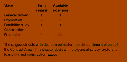 In the General Survey stage, the company is obliged to spend an agreed amount during the 12-month period. At the end of the period, the company has to submit a report detailing the items and amount of expenditure. At the end of this period the company is required to relinquish at least 25% of the original Contract Area.