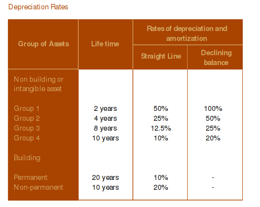 Fixed assets in the Contract Area may be depreciated under either the diminishing value or straight-line method. The rates of depreciation are specified in the CoW and are generally accelerated, with most equipment being depreciated over an 8-year effective life (25% diminishing value; 12.5% straight-line). A full year’s depreciation is allowed in the first year of use. Table 1 sets out the rates of depreciation.
