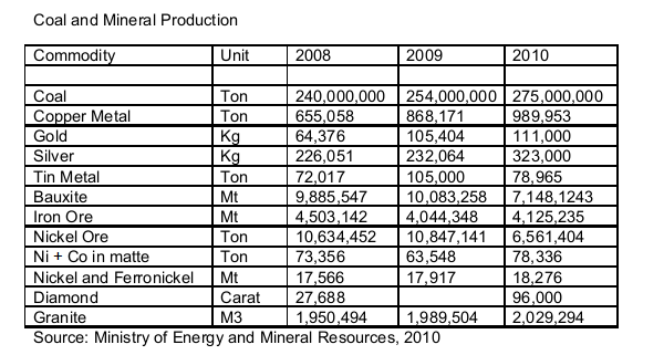 In 2010, the mineral and coal industry is still expanding as the demand for mining products like coal, tin, nickel, copper, iron ore and aluminum also increase with the improvement of the global economy. The price increase on several mineral commodities in the world market has made many mining companies to increase their production capacities. The table below shows that most mineral production for 2010 was higher than 2008 production levels.
