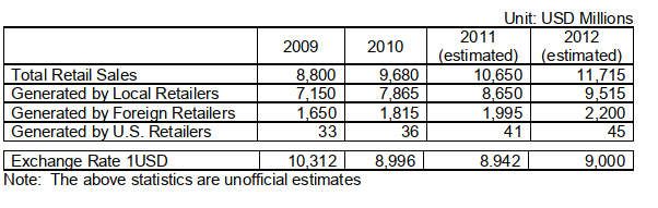 The continuous growth of the retail industry has been driven mostly by strong domestic consumption, serving as a primary factor that supports Indonesia’s economy. In 2010, total sales of Indonesia’s retail industry were expected to reach $9.68 billion, generated by more than 8,000 non-traditional retail outlets throughout the country.